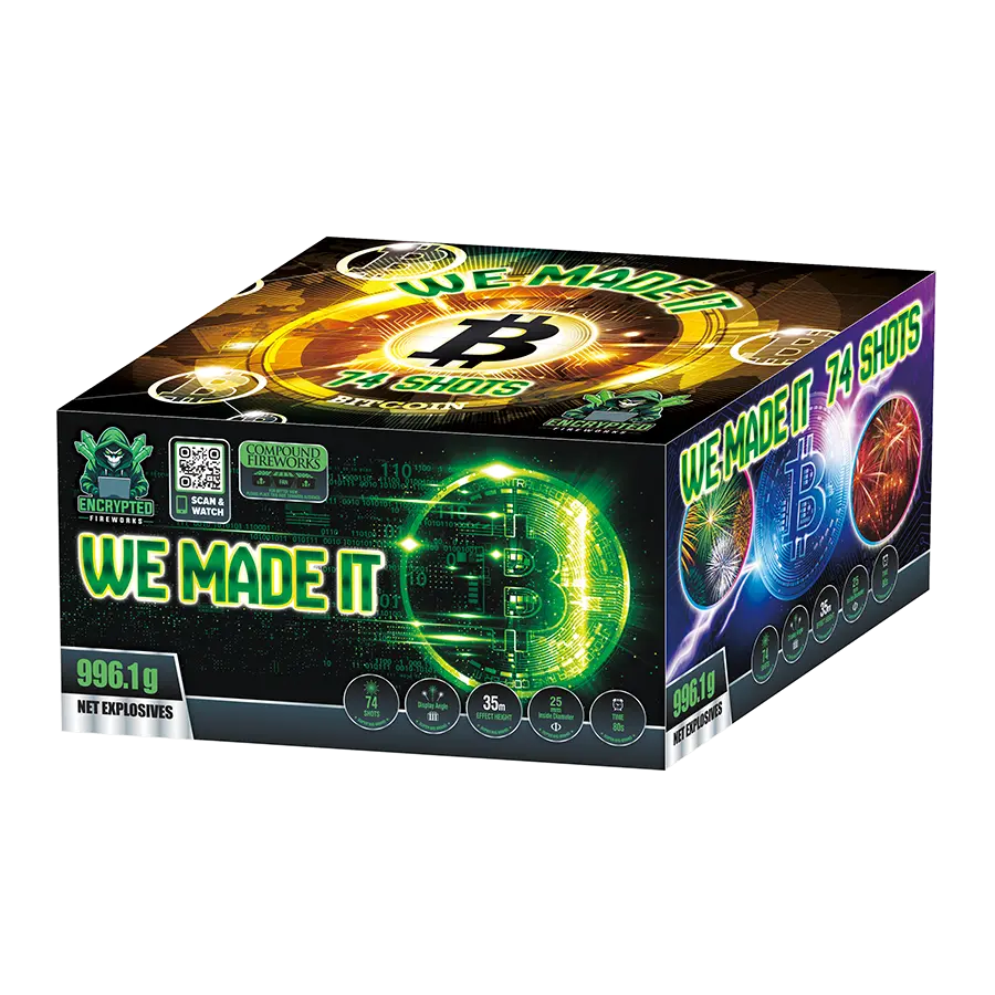 Experience the ultimate celebration with We Made It 74 Shots! This compact yet powerful firework features 74 shots with a mixed firing pattern, delivering vibrant effects and stunning visuals. Perfect for any occasion, make your next celebration unforgettable with We Made It by Encrypted Fireworks.